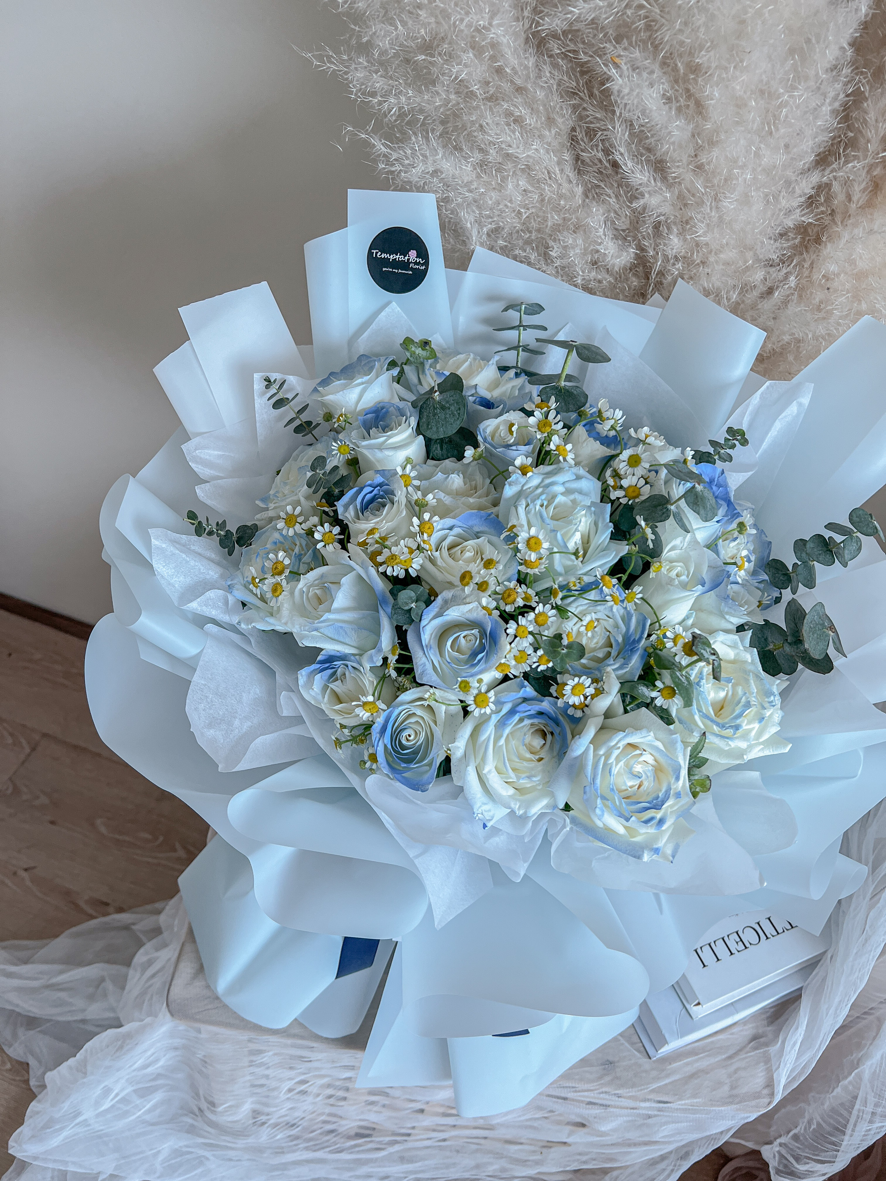- Blue Sprayed Premium White Rose (25 stalks), filled with Chamomile and Eucalyptus